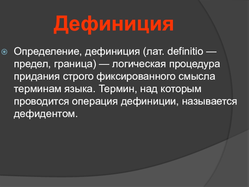 строго фиксированного смысла терминам языка. Термин, над которым проводится операция дефиниции, называется дефидентом.