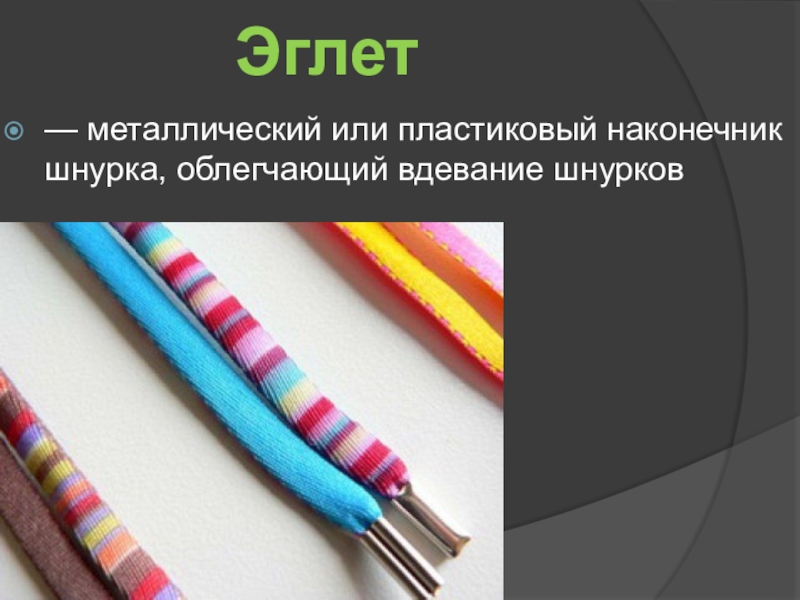 Эглет — металлический или пластиковый наконечник шнурка, облегчающий вдевание шнурков