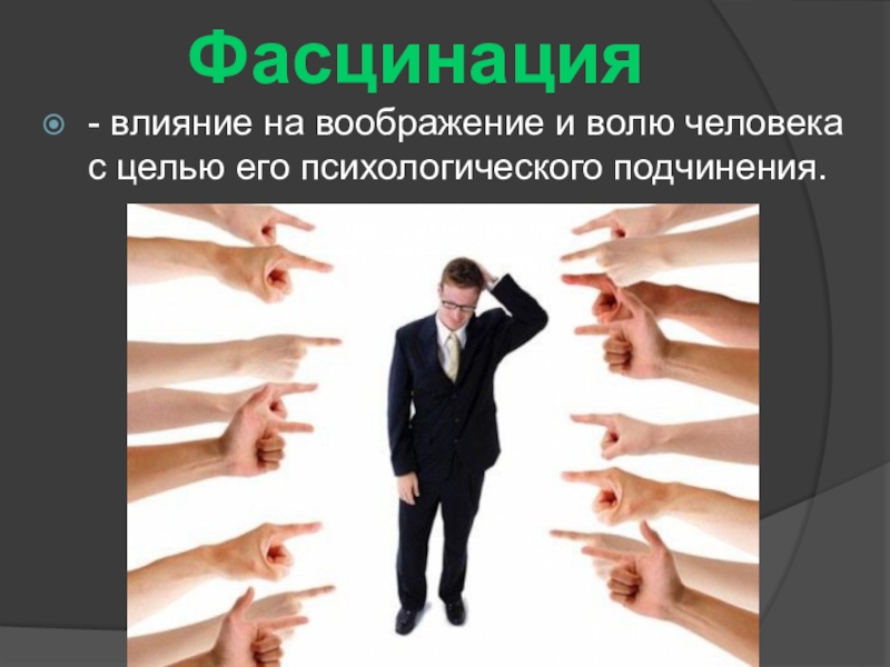 Фасцинация- влияние на воображение и волю человека с целью его психологического подчинения.
