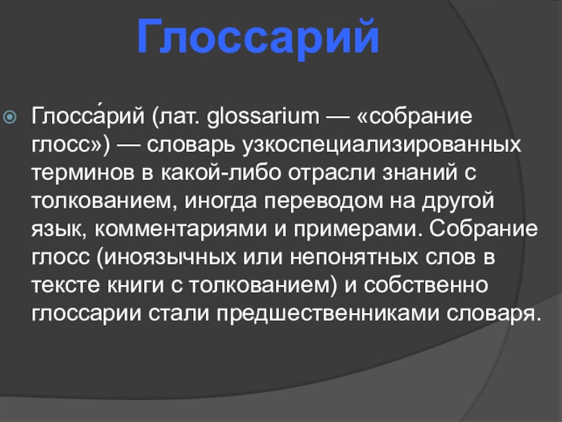ГлоссарийГлосса́рий (лат. glossarium — «собрание глосс») — словарь узкоспециализированных терминов в какой-либо отрасли знаний с толкованием, иногда переводом на другой язык, комментариями и примерами. Собрание глосс (иноязычных или непонятных слов в тексте книги с толкованием) и