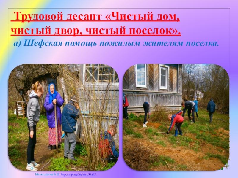 Трудовой десант «Чистый дом, чистый двор, чистый поселок».а) Шефская помощь пожилым жителям поселка.