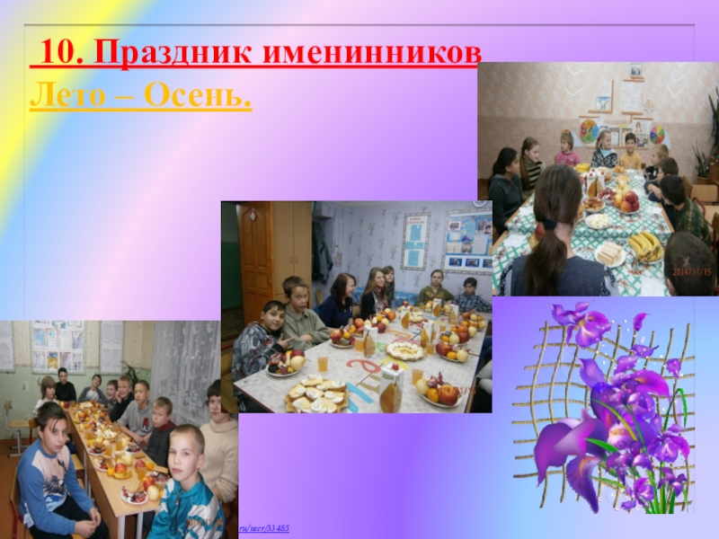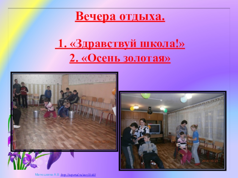 Слайд 13 Вечера отдыха. 1. «Здравствуй школа!» 2. «Осень золотая»