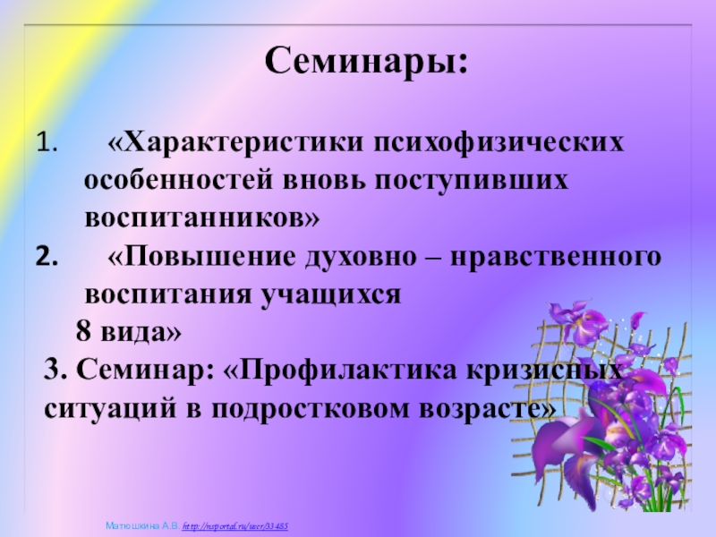 Семинары:  «Характеристики психофизических особенностей вновь поступивших воспитанников»  «Повышение духовно – нравственного воспитания учащихся  8