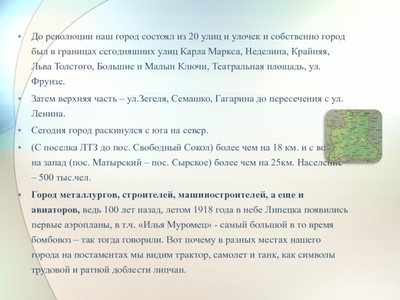 Город металлургов, строителей, машиностроителей, а еще и авиаторов, ведь 100 лет назад, летом 1918 года в небе Липецка появились первые аэропланы, в т.ч. «Илья Муромец» - самый большой в то время бомбовоз – так тогда говорили. Вот почему в разных местах нашего города на постаментах мы видим трактор, самолет и танк, как символы трудовой и ратной доблести липчан.