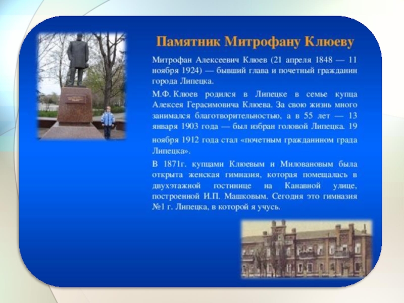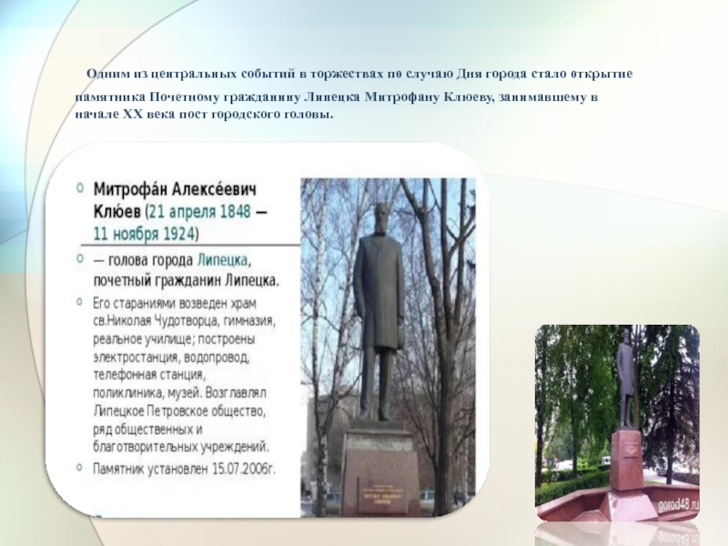 стало открытие памятника Почетному гражданину Липецка Митрофану Клюеву, занимавшему в начале ХХ века пост городского головы.