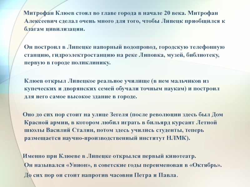 20 века. Митрофан Алексеевич сделал очень много для того, чтобы Липецк приобщился к благам цивилизации.