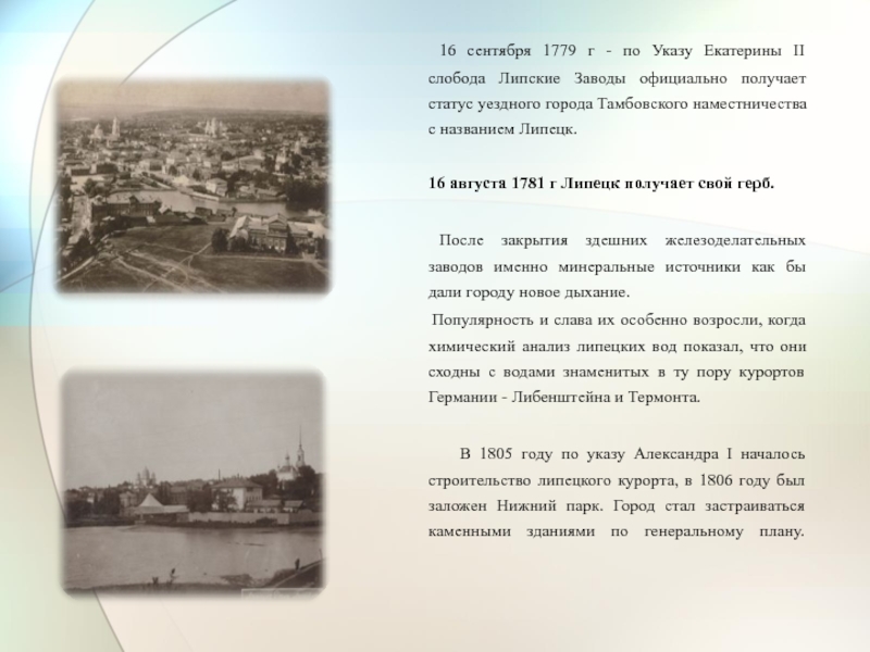 В 1805 году по указу Александра I началось строительство липецкого курорта, в 1806 году был заложен Нижний парк. Город стал застраиваться каменными зданиями по генеральному плану.