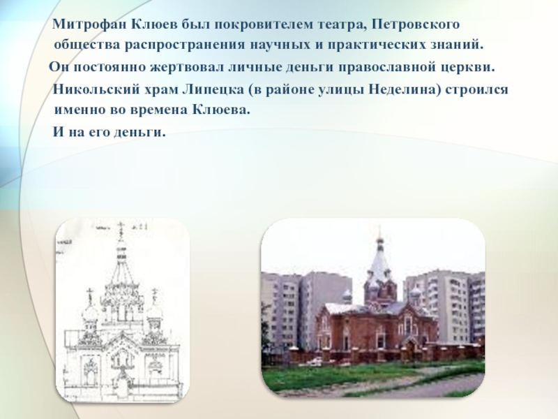 Слайд 32 Митрофан Клюев был покровителем театра, Петровского общества распространения научных