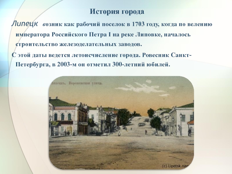 Липецк возник как рабочий поселок в 1703 году, когда по велению императора Российского Петра I на реке Липовке, началось строительство железоделательных заводов.