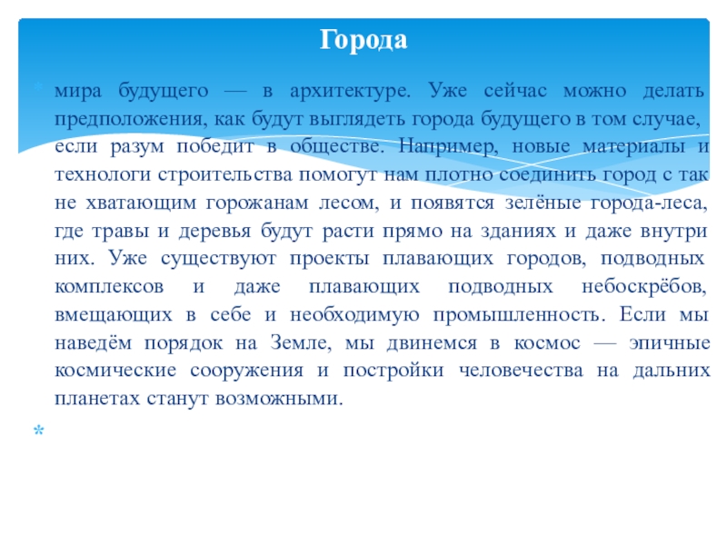 Слайд 4мира будущего — в архитектуре. Уже сейчас можно делать предположения, как