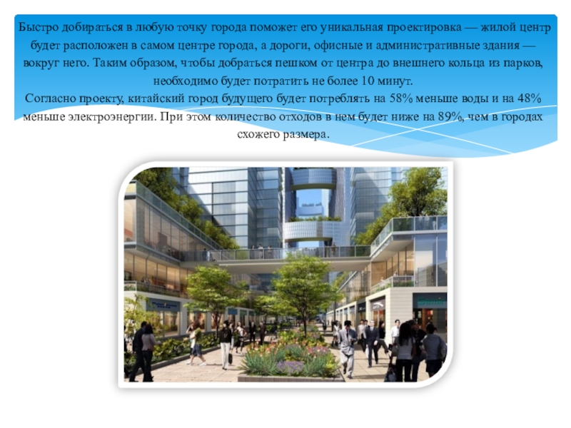 Согласно проекту, китайский город будущего будет потреблять на 58% меньше воды и на 48% меньше электроэнергии. При этом количество отходов в нем будет ниже на 89%, чем в городах схожего размера.