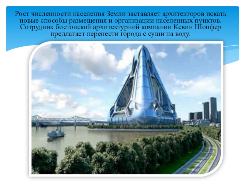 организации населенных пунктов. Сотрудник бостонской архитектурной компании Кевин Шопфер предлагает перенести города с суши на воду.