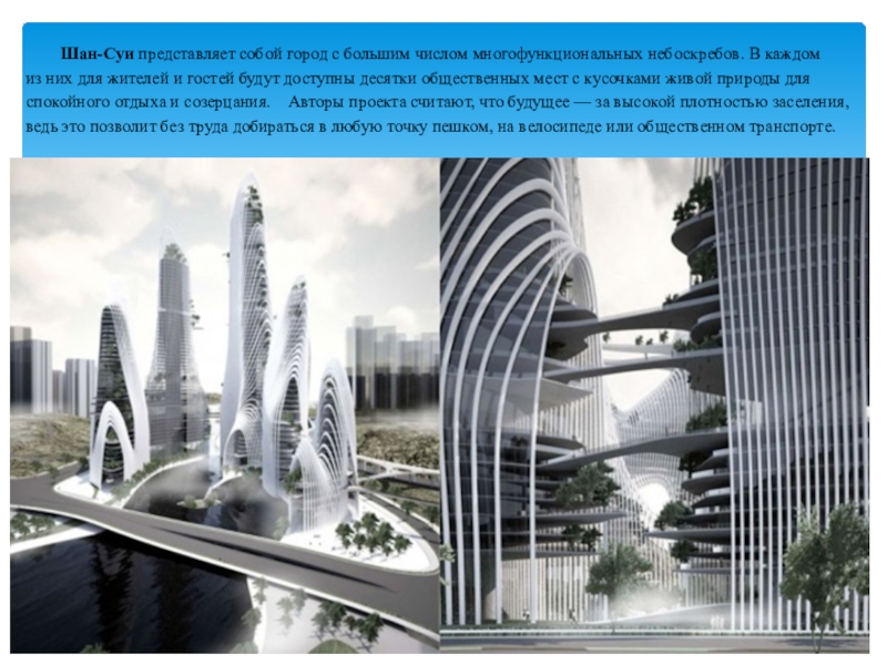 небоскребов. В каждом из них для жителей и гостей будут доступны десятки общественных мест с кусочками живой природы для спокойного отдыха и созерцания. Авторы проекта считают, что будущее — за высокой плотностью заселения, ведь это позволит без труда добираться в любую точку пешком, на велосипеде или общественном транспорте.