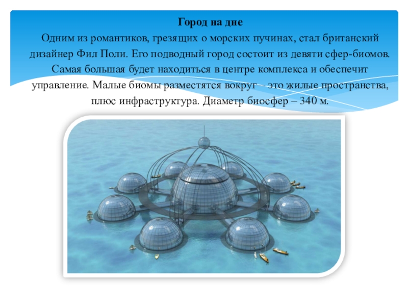 дизайнер Фил Поли. Его подводный город состоит из девяти сфер-биомов. Самая большая будет находиться в центре комплекса и обеспечит управление. Малые биомы разместятся вокруг – это жилые пространства, плюс инфраструктура. Диаметр биосфер – 340 м.