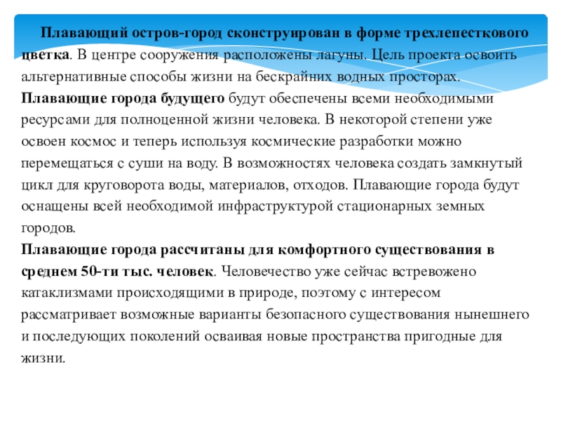 Слайд 14 Плавающий остров-город сконструирован в форме трехлепесткового цветка. В