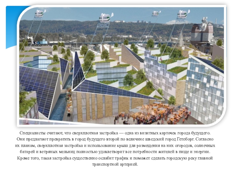 превратить в город будущего второй по величине шведский город Гетеборг. Согласно их планам, сверхплотная застройка и использование крыш для размещения на них огородов, солнечных батарей и ветряных мельниц полностью удовлетворит все потребности жителей в пище и энергии.