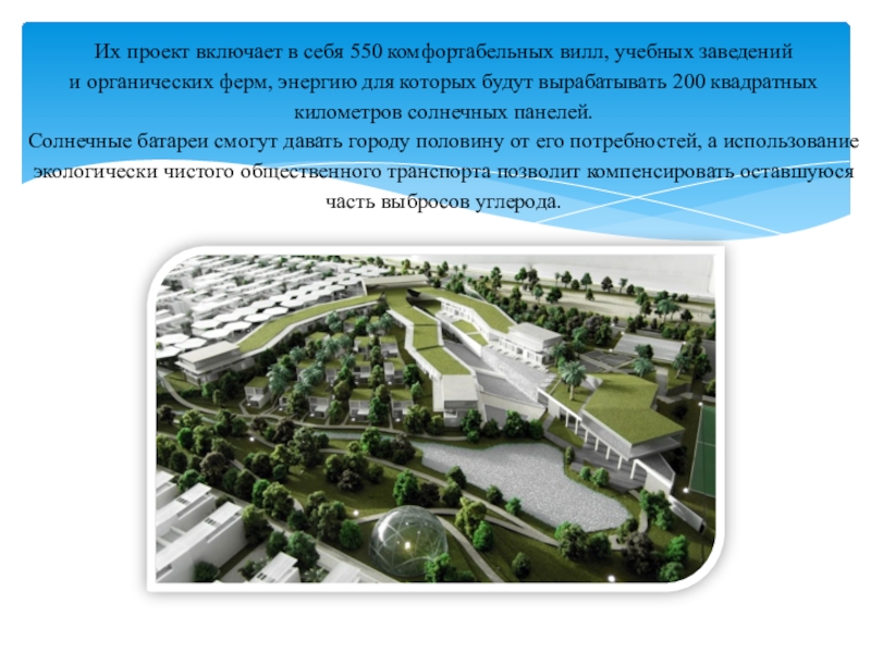 Слайд 24Их проект включает в себя 550 комфортабельных вилл, учебных заведений и органических ферм, энергию