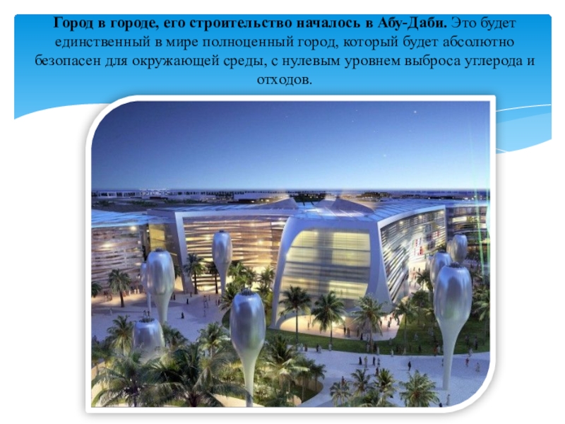 Слайд 22Город в городе, его строительство началось в Абу-Даби. Это будет единственный