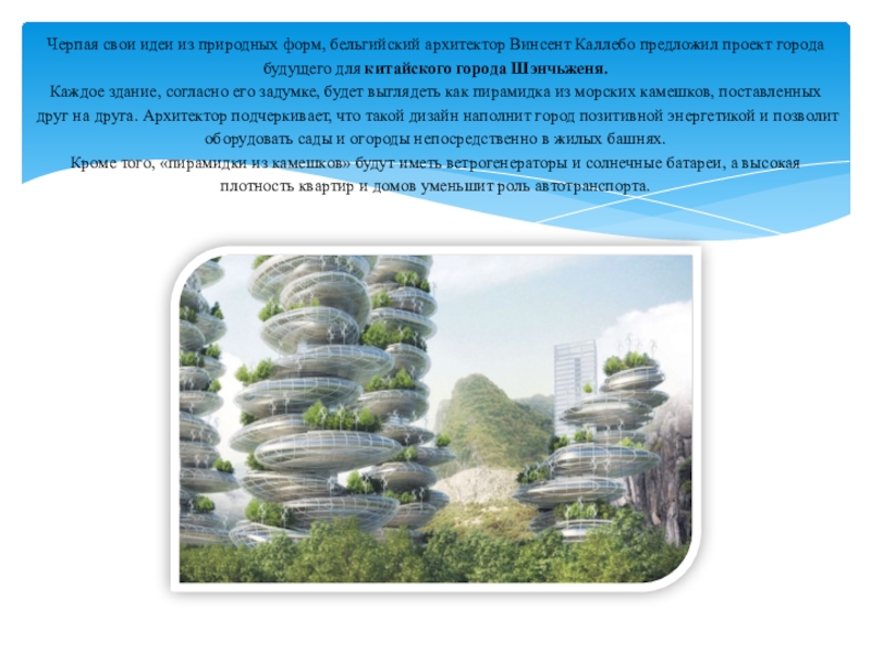 Слайд 28Черпая свои идеи из природных форм, бельгийский архитектор Винсент Каллебо предложил проект
