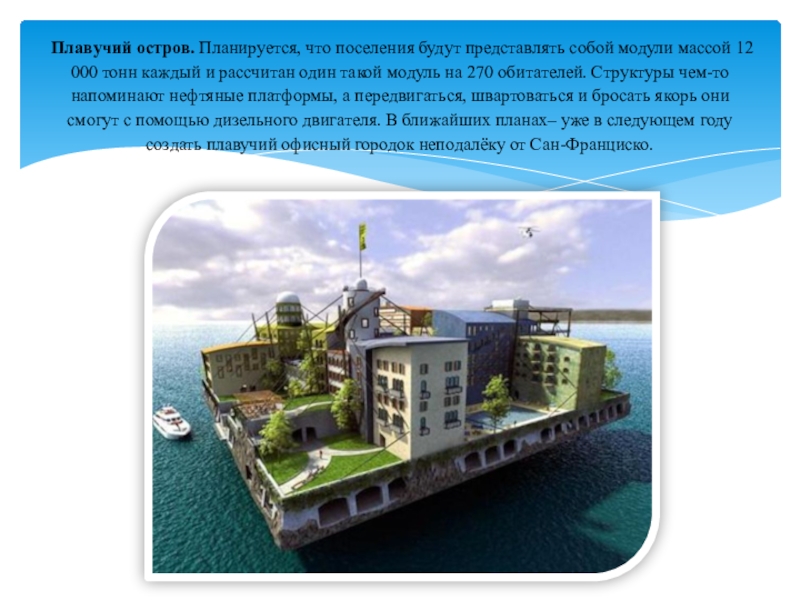 000 тонн каждый и рассчитан один такой модуль на 270 обитателей. Структуры чем-то напоминают нефтяные платформы, а передвигаться, швартоваться и бросать якорь они смогут с помощью дизельного двигателя. В ближайших планах– уже в следующем году создать плавучий офисный городок неподалёку от Сан-Франциско.