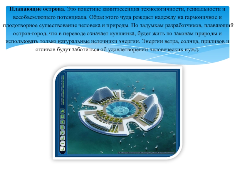 Слайд 15Плавающие острова. Это поистине квинтэссенция технологичности, гениальности и всеобъемлющего потенциала. Образ