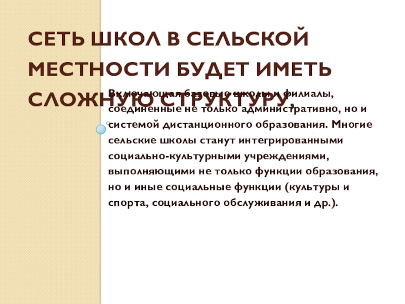 Слайд 9Сеть школ в сельской местности будет иметь сложную структуру,