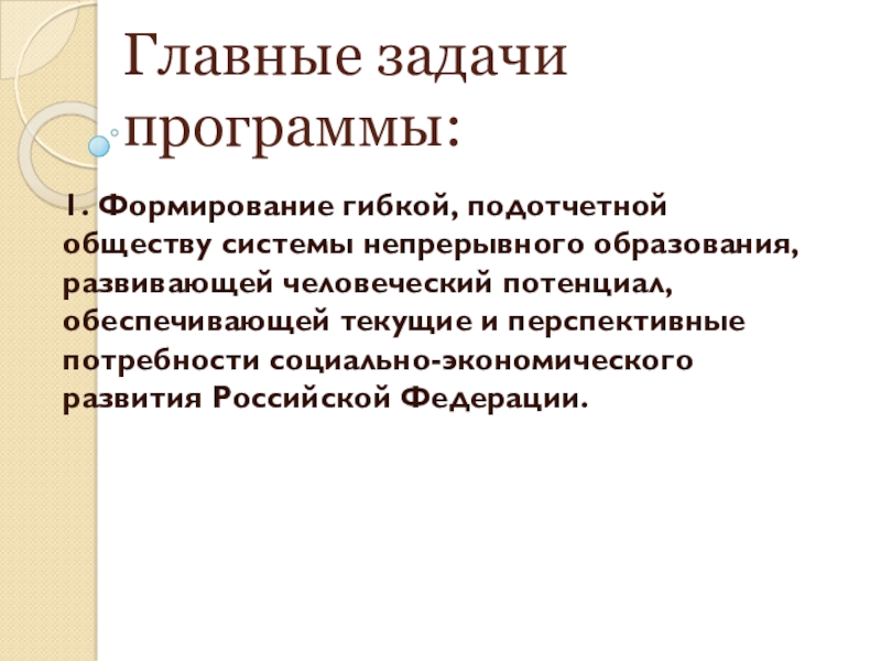 Главные задачи программы:1. Формирование гибкой, подотчетной обществу системы непрерывного образования, развивающей человеческий потенциал, обеспечивающей текущие и перспективные