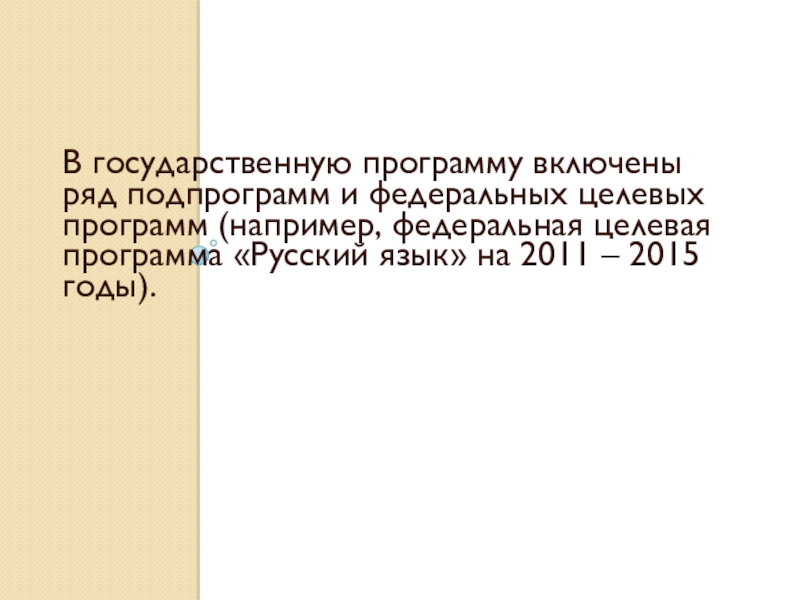 В государственную программу включены ряд подпрограмм и федеральных целевых программ (например, федеральная целевая программа «Русский язык» на