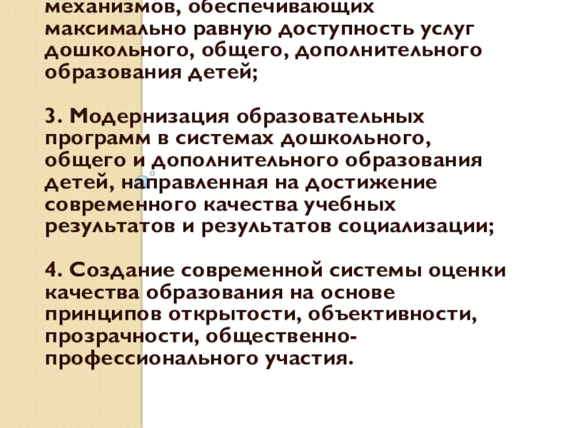 2. Развитие инфраструктуры и организационно-экономических механизмов, обеспечивающих максимально равную доступность услуг дошкольного, общего, дополнительного образования детей;3. Модернизация