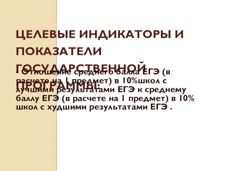 Целевые индикаторы и показатели Государственной программы:- Отношение среднего балла ЕГЭ (в расчете на 1 предмет) в 10%школ