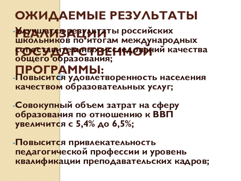 Ожидаемые результаты реализации государственной программы:Улучшатся результаты российских школьников по итогам международных сопоставительных исследований качества общего образования;Повысится удовлетворенность