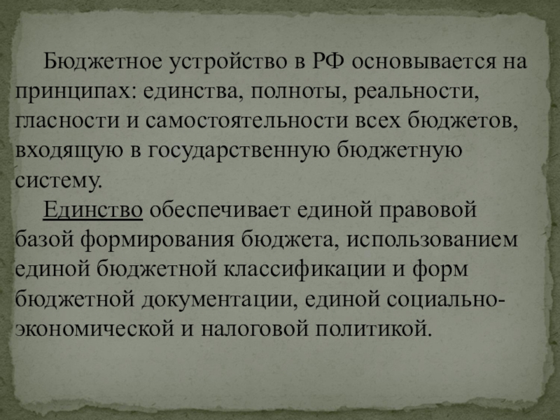 Единство обеспечивает единой правовой базой формирования бюджета, использованием единой бюджетной классификации и форм бюджетной документации, единой социально-экономической и налоговой политикой.