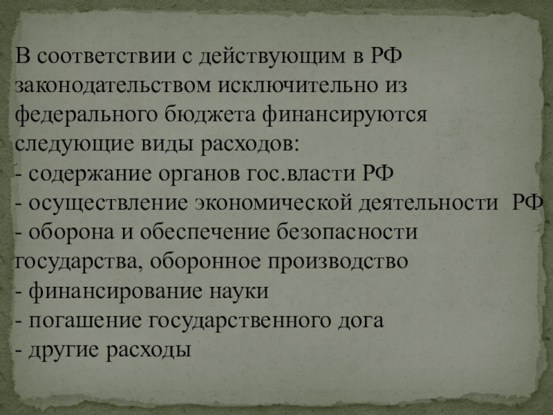 Слайд 16В соответствии с действующим в РФ законодательством исключительно из федерального бюджета