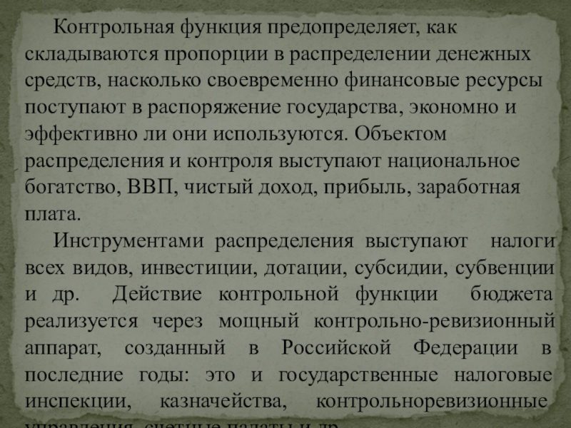 Слайд 9 Контрольная функция предопределяет, как складываются пропорции в распределении денежных средств, насколько