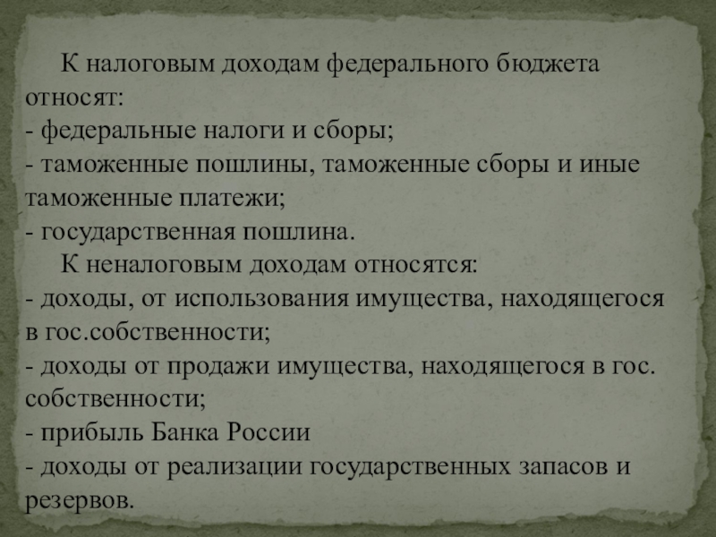 Федеральный бюджет в соответствии с Налоговым Кодексом РФ наделен федеральными налогами и неналоговыми доходами.