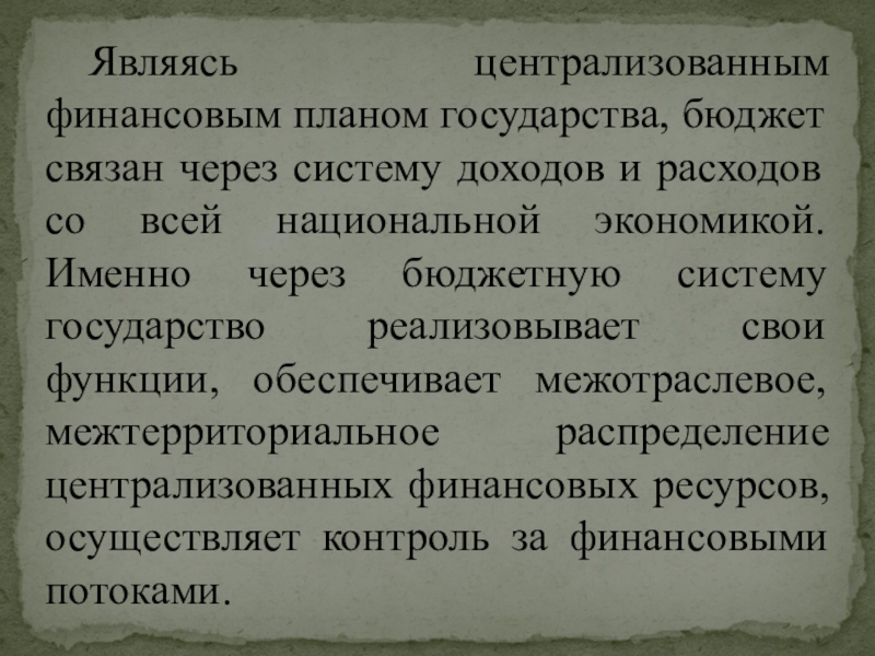 Слайд 6 Являясь централизованным финансовым планом государства, бюджет связан через систему доходов и