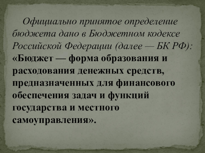 Слайд 7 Официально принятое определение бюджета дано в Бюджетном кодексе Российской Федерации (далее