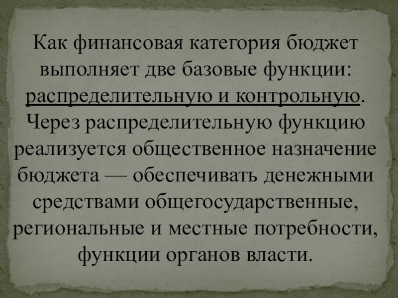 Слайд 8Как финансовая категория бюджет выполняет две базовые функции: распределительную и контрольную.