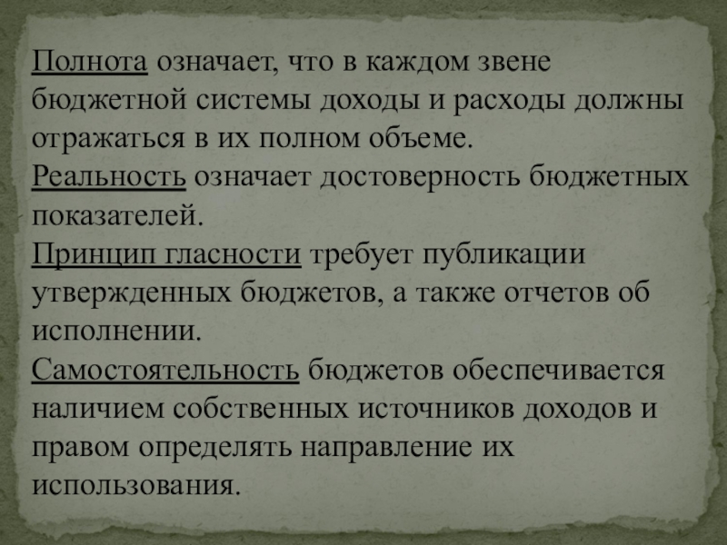 Слайд 13Полнота означает, что в каждом звене бюджетной системы доходы и расходы
