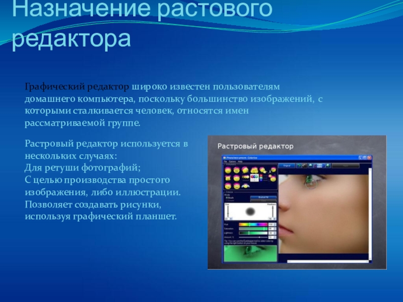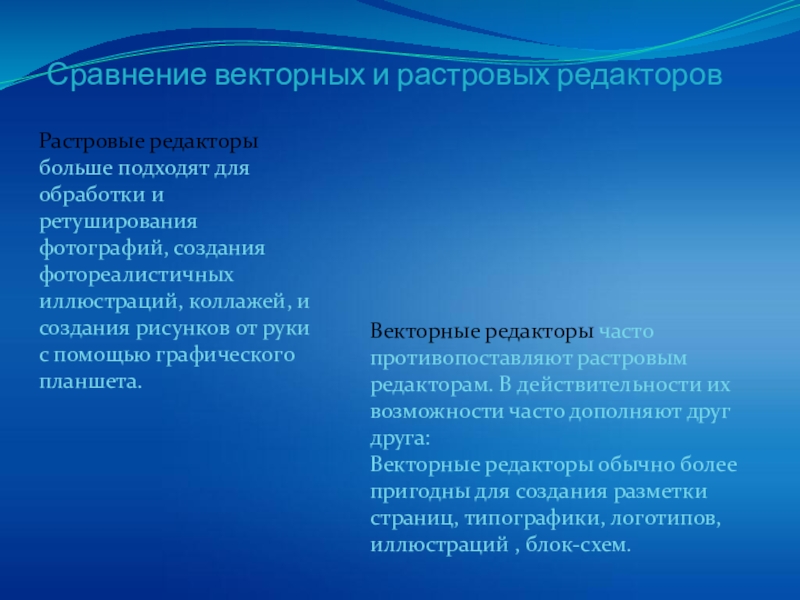 Растровые редакторы больше подходят для обработки и ретуширования фотографий, создания фотореалистичных иллюстраций, коллажей, и создания рисунков от руки с помощью графического планшета.