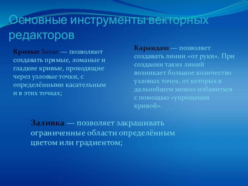 Кривые Безье — позволяют создавать прямые, ломаные и гладкие кривые, проходящие через узловые точки, с определёнными касательными в этих точках;