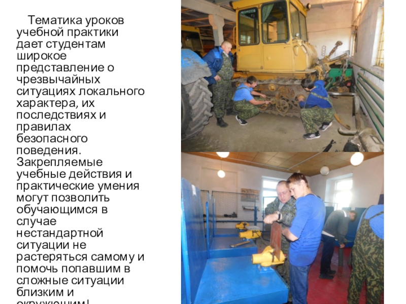 Слайд 16 Тематика уроков учебной практики дает студентам широкое представление о чрезвычайных ситуациях
