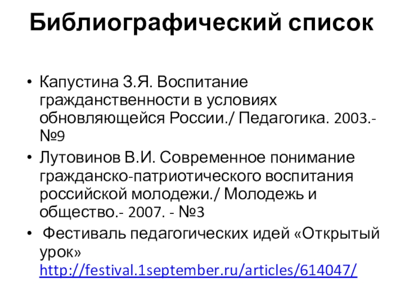 Капустина З.Я. Воспитание гражданственности в условиях обновляющейся России./ Педагогика. 2003.-