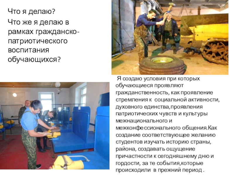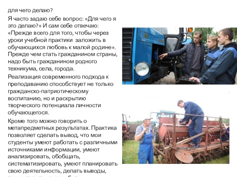 делаю?» И сам себе отвечаю: «Прежде всего для того, чтобы через уроки учебной практики заложить в обучающихся любовь к малой родине». Прежде чем стать гражданином страны, надо быть гражданином родного техникума, села, города.