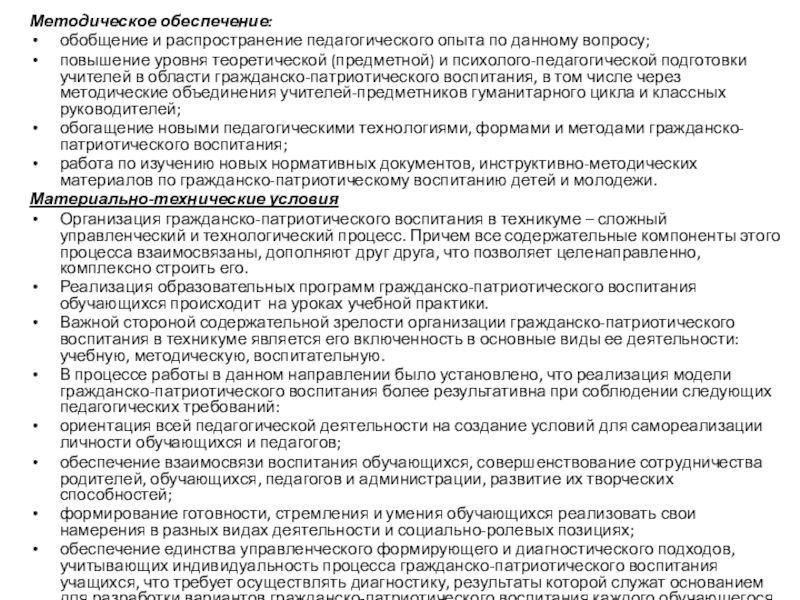 Важной стороной содержательной зрелости организации гражданско-патриотического воспитания в техникуме является его включенность в основные виды ее деятельности: учебную, методическую, воспитательную.