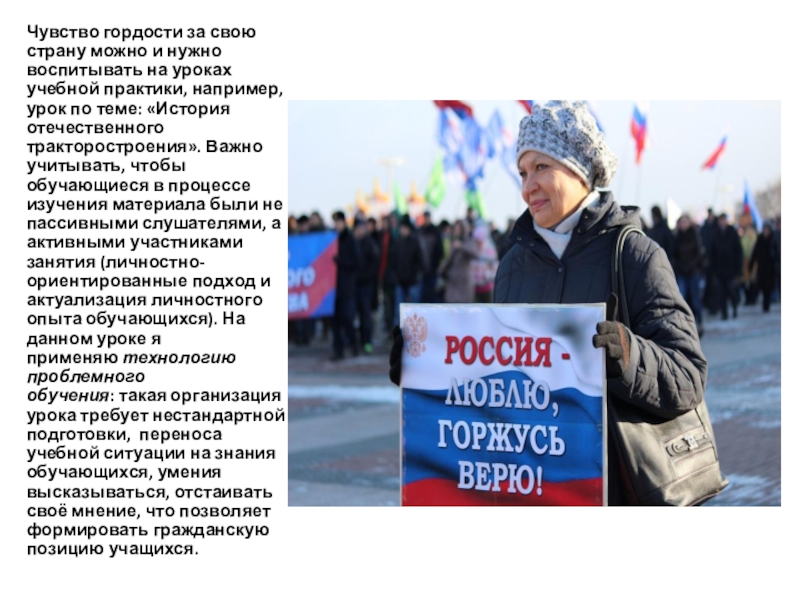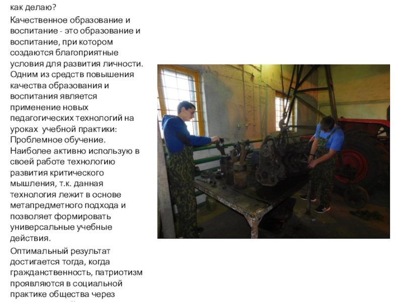 учебной практики, например, урок по теме: «История отечественного тракторостроения». Важно учитывать, чтобы обучающиеся в процессе изучения материала были не пассивными слушателями, а активными участниками занятия (личностно-ориентированные подход и актуализация личностного опыта обучающихся). На данном уроке я применяю технологию проблемного обучения: такая организация урока требует нестандартной подготовки, переноса учебной ситуации на знания обучающихся, умения высказываться, отстаивать своё мнение, что позволяет формировать гражданскую позицию учащихся.