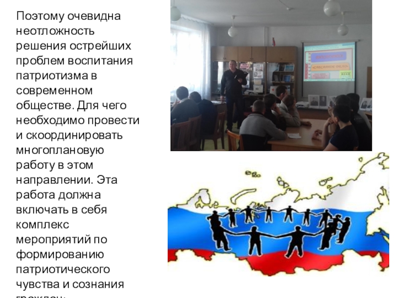Слайд 9Поэтому очевидна неотложность решения острейших проблем воспитания патриотизма в современном обществе.