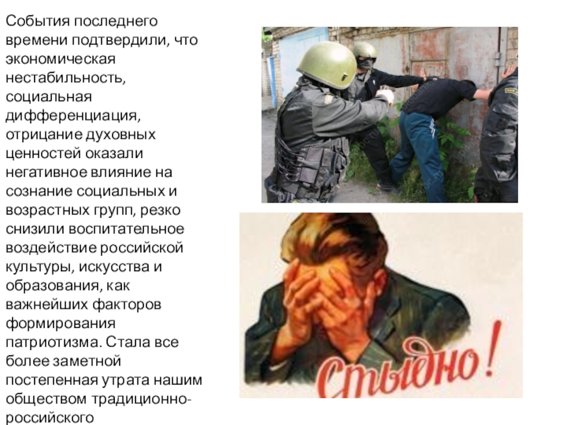 Слайд 8События последнего времени подтвердили, что экономическая нестабильность, социальная дифференциация, отрицание духовных