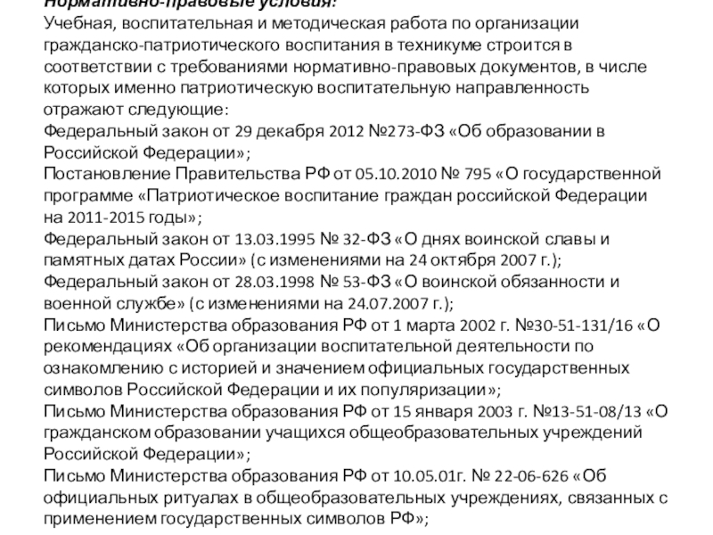 техникуме строится в соответствии с требованиями нормативно-правовых документов, в числе которых именно патриотическую воспитательную направленность отражают следующие:
