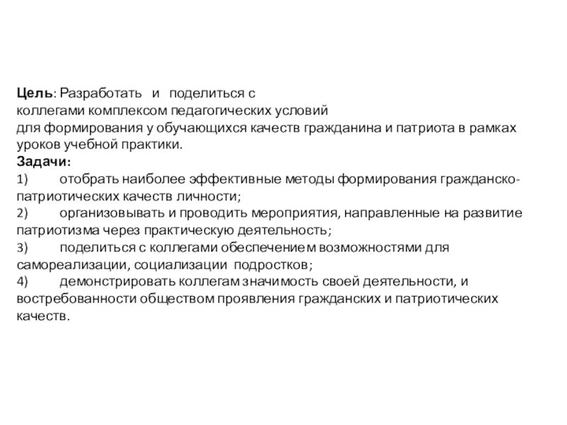 Слайд 2Цель: Разработать и поделиться с коллегами комплексом педагогических условий